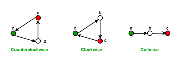 반대로 가운데의 경우 ab의 기울기가 더 크므로 Clockwise가 되며, 오른쪽과 같이 두 기울기가 같다면 Collinear가 된다.